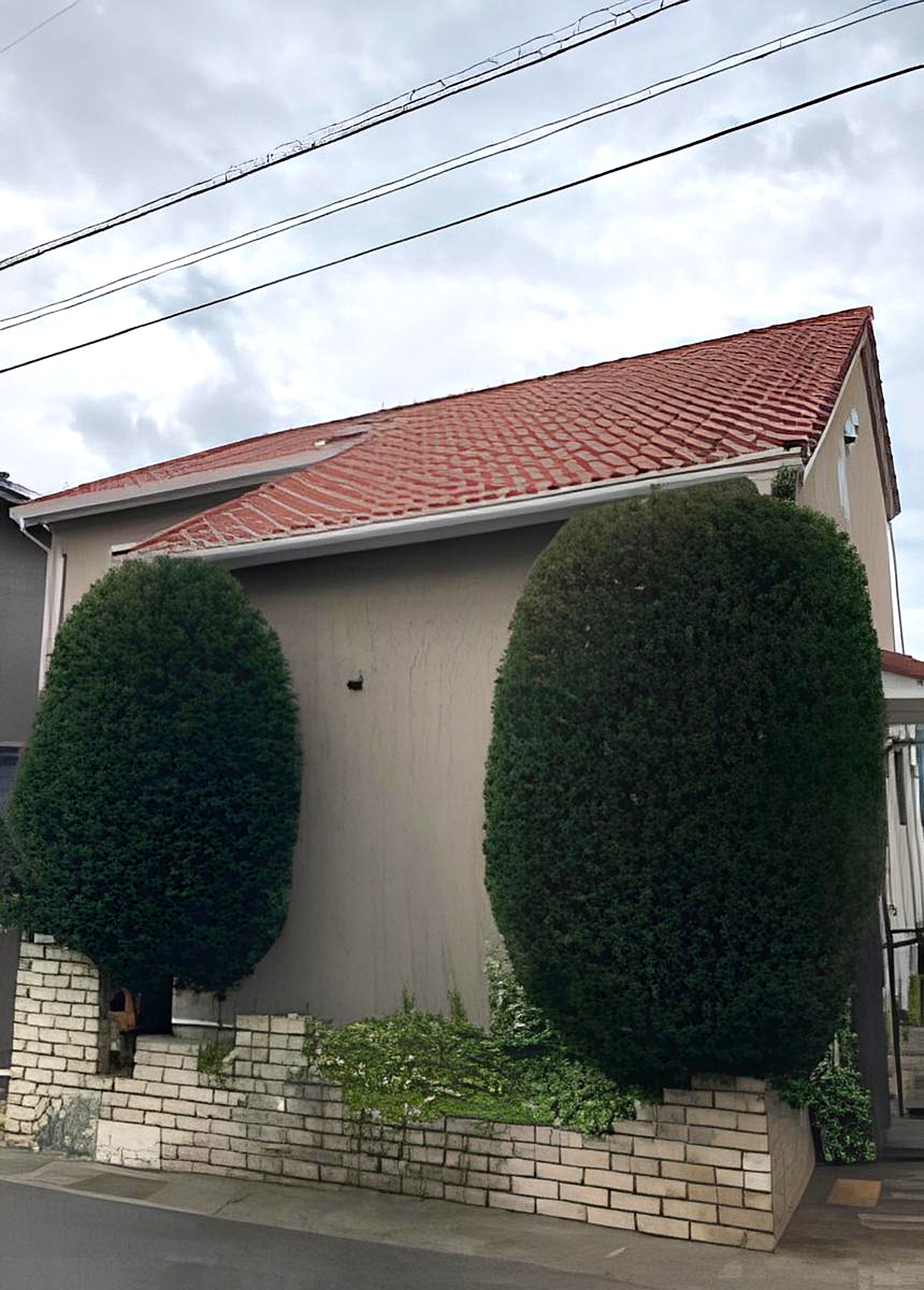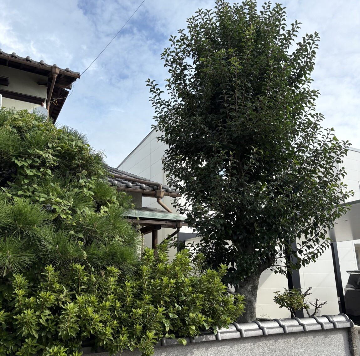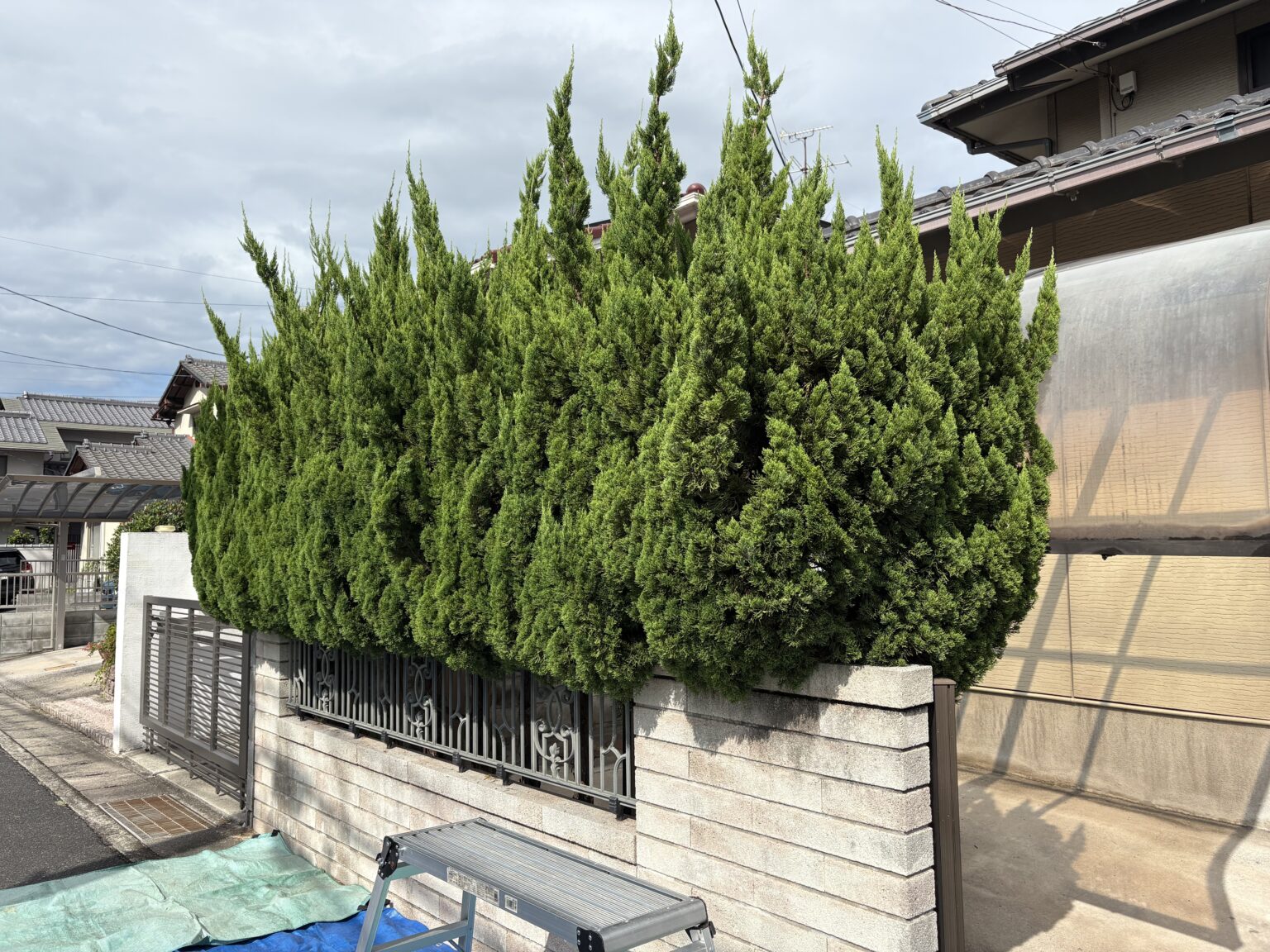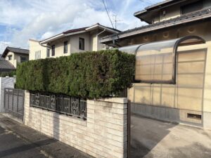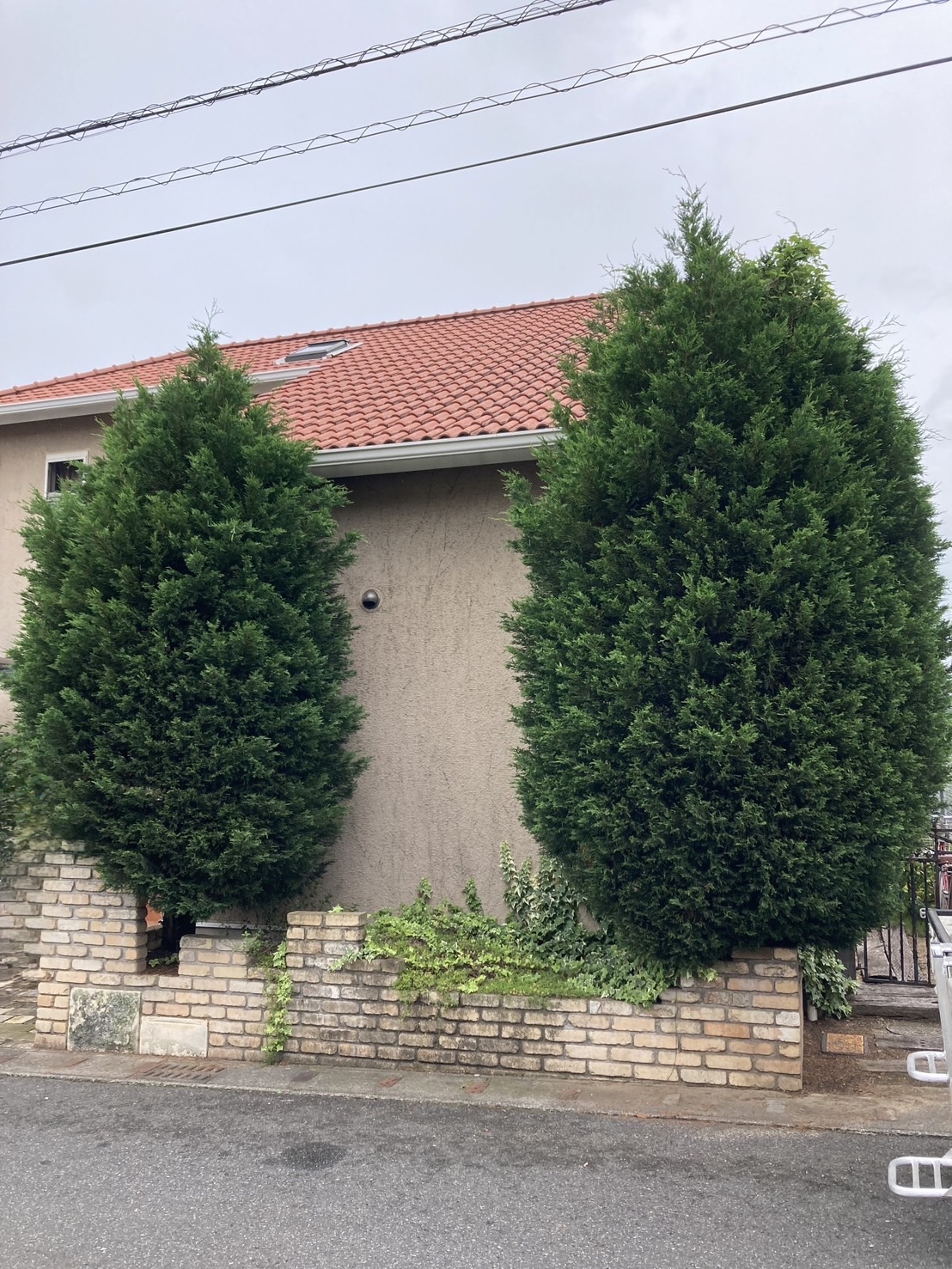 今回お伺いした現場は、非常に素敵な洋風のご自宅でした。建物と道路を隔てる外構スペースに2本のコニファーが植えられていましたが、枝が四方に広がり、本来のスタイリッシュな印象が少し損なわれている状態でした。
